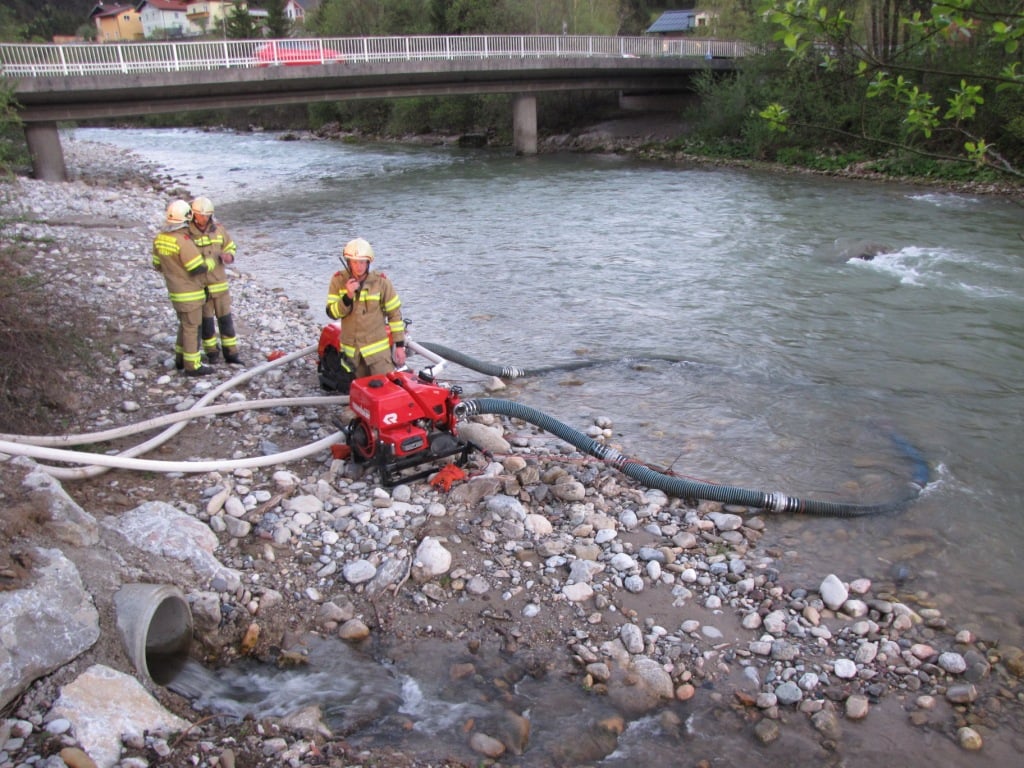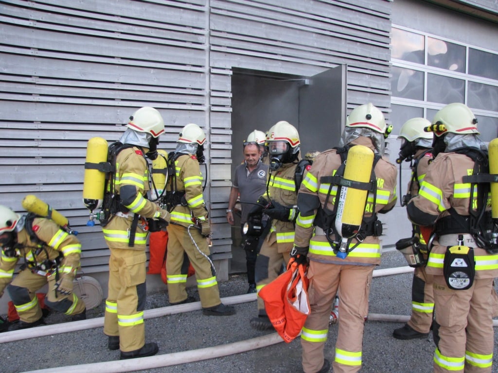 Alle Einsatzkräfte stellten zusammen mit 4 Tragkraftspritzen eine Wasserversorgung von der angrenzenden Lammer mit mehreren Zubringleitungen zu den Tanklöschfahrzeugen rund um das Übungsobjekt her. Es standen insgesamt 7 ausgerüstete Atemschutztrupps am eingerichteten Atemschutzsammelplatz bereit, wovon 4 Trupps die letztendlich 8 vermissten Personen aus dem stark verrauchten Firmengebäude retteten. Die Atemschutztrupps waren großteils mit Wärmebildkameras ausgerüstet, berichteten dennoch von einer sehr schwierigen Situation, zwischen den vielen Regalelementen, Anlagen und im oberen Stockwerk die Personen zu finden. Im Außenbereich um das Übungsobjekt wurden 3 Wasserwerfer, die Drehleiter Abtenau und mehrere B-, C- und Hochdruckrohre zur Brandbekämpfung betrieben. Für den Löschangriff am Dach wurden drei 14m Schiebeleitern aufgebaut.